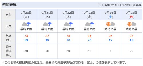今年はシルバーウィークとは言わないようですが、今週は途中休暇をとり、10連休となっておりまして、最初の1.5日は営農組合の作業になりました。この後は特に予定もありませんが、ポケモン狩りを兼ねてウォーキングに出かけたいところです。ただ、週間天気予報のとおり、雨模様が多いようでイマイチの天候です。