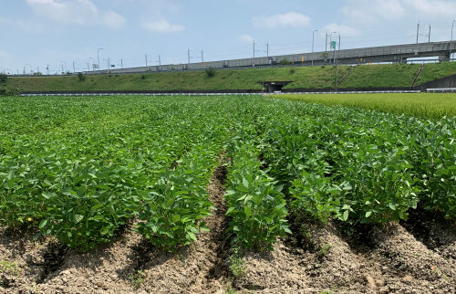暑い日が続いている今日この頃ですが、田んぼの大豆も生長してきました。ちょっと背丈が低いようですが、元気なようです。 畦道との間に雑草が生い茂るのでいままでに数回除草剤を散布しまして、稲作よりも管理が大変です。
