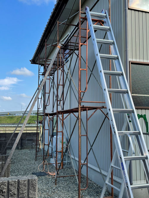 納屋の雨樋の下の木(鼻隠しというらしい)にクマバチが巣を作っており、建物の周りに多数の穴があいておりまして、先日から、駆除と穴をパテで埋める作業を始めました。知り合いの木材店から足場を借りまして、組立て、解体を繰り返しております。やっぱり、高所は怖いですね。慎重に作業しておりますが、今日の暑さには参りました。いずれ完了しましたら、DIYのページで紹介したいと思います。