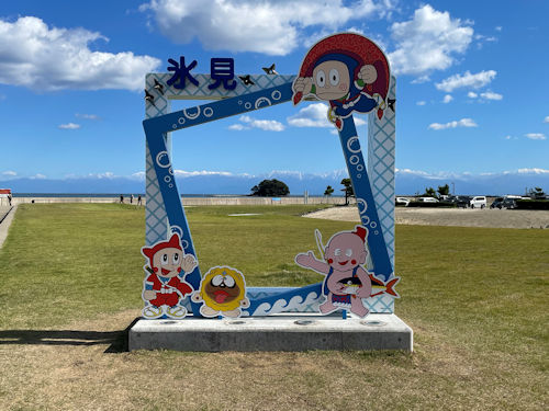先月に引き続き、氷見・比美乃江公園にウォーキングに行ってみました。今日は快晴の天候でたくさんの人が訪れておりました。海越しの立山連峰を背景に富山県氷見市出身の漫画家、藤子不二雄(A)さんが生んだ「忍者ハットリくん」のキャラクターと記念撮影できるフォトフレーム風のモニュメントが造られておりまして、9月22日に完成したものらしいです。お昼は、ひみ番屋街で買ったお寿司を美味しくいただきました。